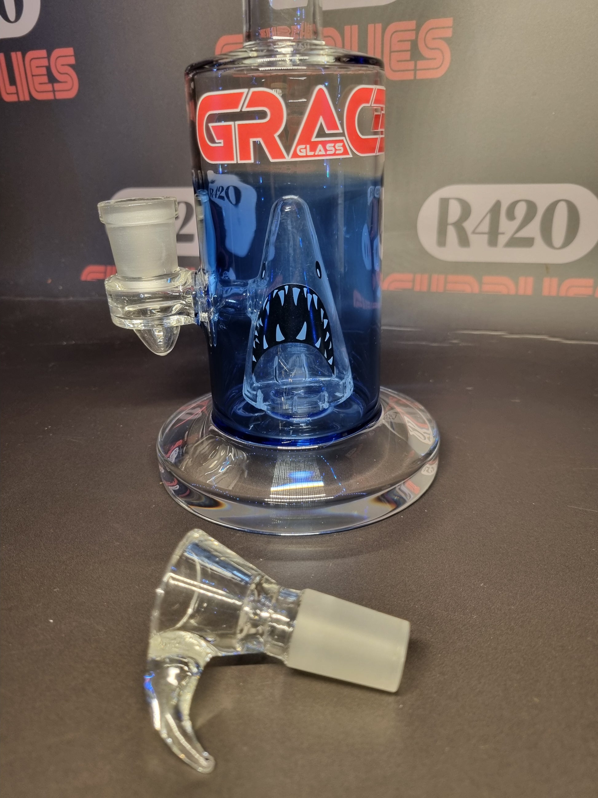 Dive into deep-blue sessions with the Grace Glass "Shark Attack" Bong in Ocean Blue. Standing at 28cm tall, this bold piece is crafted from tinted borosilicate glass and features a striking shark motif.